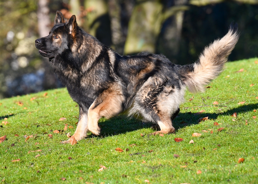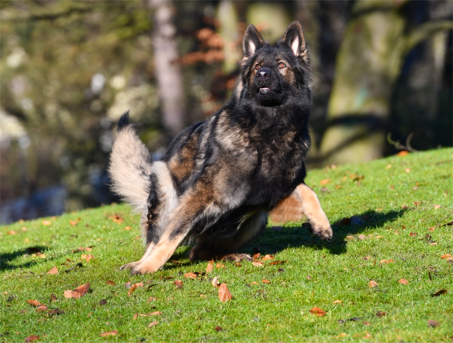 ![]() Derselbe Hund ein paar Wochen/Monate später. Das graue Fell, man nennt auch diese Farbe *grau* ist immer zweifarbig. Das einzelne Haar beim Grauen Hund ist immer... wirklich immer... unten hell und oben, der Haarschaft ist dunkel. Da das dunkle Fell oben ist und der Hund langhaarig ist, fällt die dunkle Haarspitze als erstes auf und legt sich zudem um den Hundekörper. So wirkt der Hund im Laufe der Jahre immer dunkler, als die eigentliche Farbe ist. Ninja ist eine Hündin mit enormer Körperkraft. Sie ist mächtig und sie ist kompakt. Kurz und kräftig, der Rücken absolut gerade, die Pfoten sind nicht lang und durchtrittig , wie bei inzwischen so vielen Schäferhunden die ich sehe, sondern kurz, rund, sogenannte Katzen oder auch Hasenpfoten. Ich muss mal Beispielbilder machen. Damit man genauer sieht was ich meine. Sie steht aufrecht, immer den Kopf stolz erhoben. Sie ist aufmerksam, interessiert sich nicht für andere Hunde, Katzen sind ihre Freunde. Kinder findet sie ebenfalls in Ordnung. Jagen, das Wort hat sie nicht erfunden und sie steht und schaut den Rehen nach wenn sie davon laufen. Aber hinterher jagen...neeeee niemals. Ninja ist immer gehorsam, bei ihr finde ich ernsthaft nichts was man bemängeln könnte. Sei es wesenstechnisch noch ihr Exterieur. Sie läuft gerne wie fast alle Hunde und sie hat eine total schöne Eigenart.....sie tanzt. Wenn man ihr alleine den Ball zur Verfügung stellt dann *tanzt* sie mit dem Ball. Anders kann ich das nicht bezeichnen. Sie hüpft und stellt sich auf die Hinterhand umrundet den Ball, springt hin und wieder weg. Es zaubert jedem ein staunendes Lächeln ins Gesicht wer das sieht. Habe einige Videos davon gemacht. Ninja wirkt jetzt dunkler als ihre Farbe wirklich ist, sie trägt zudem Silber und auch wolfsfarbe. Sie einen schönen Kopf mega gute Fellanlage und eben ein angenehmes freundliches Wesen. Für mich die zur Zeit schönste Hündin hier. |