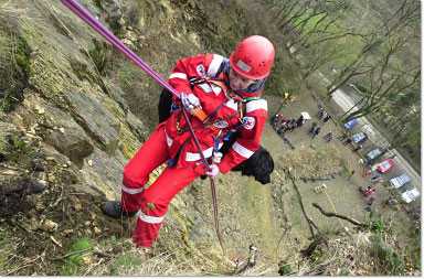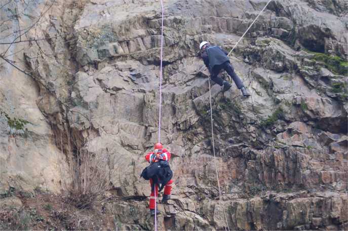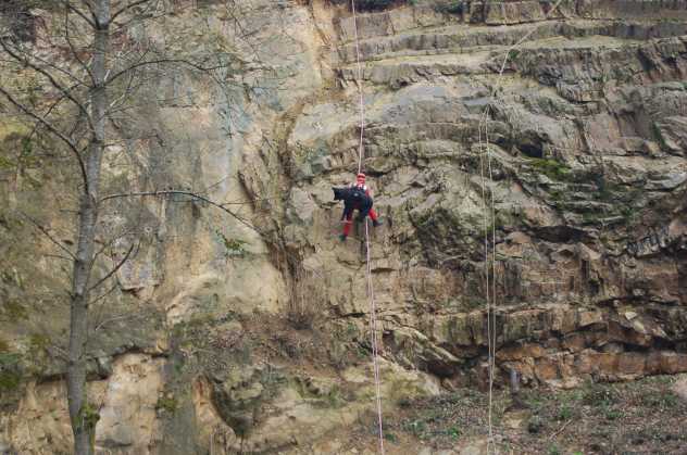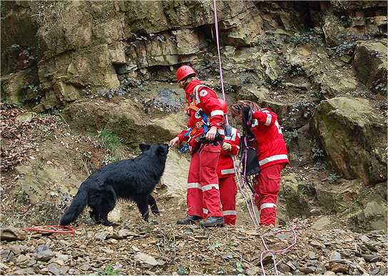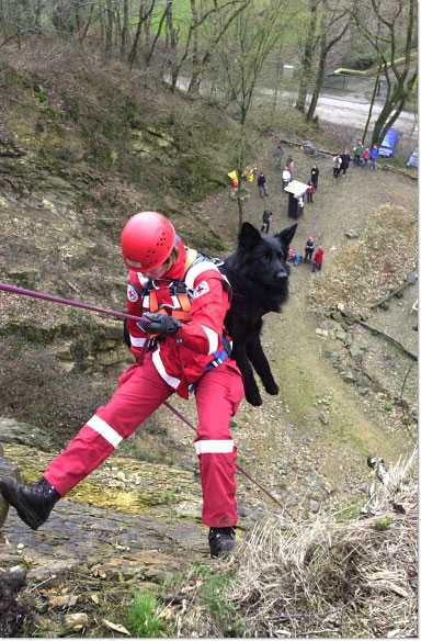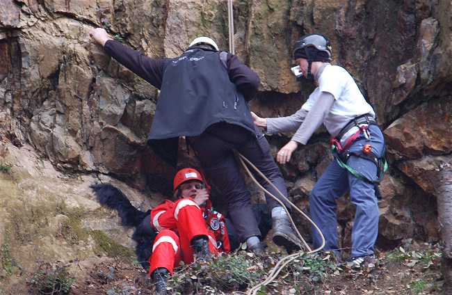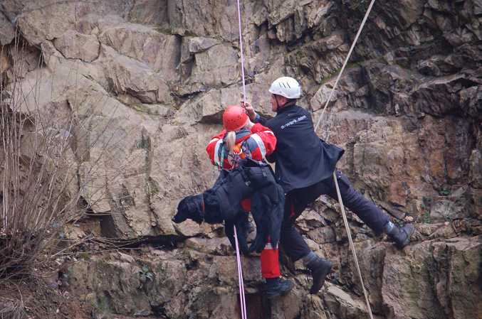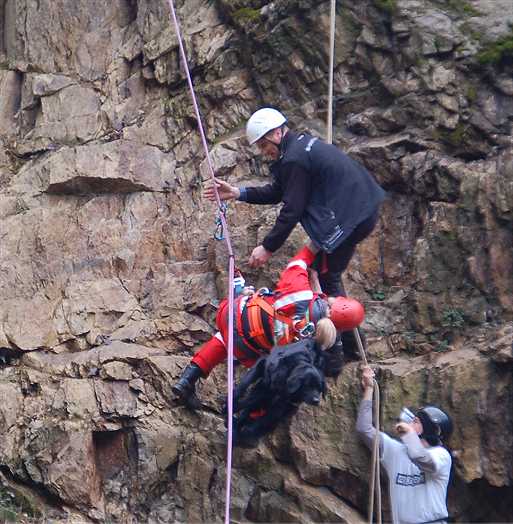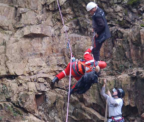 Elke mit Spike, aber da ging dann ordentlich was schief und dann konnte die Rettungsmannschaft auch gleich den wirklichen Notfall üben. Bei Elke verhedderte sich ein Knoten in der Abseilleine und sie kam weder vorwärts noch rückwärts und das mit Hund auf dem Rücken, das ist nicht wirklich witzig..Ich denke die Arme werden immer länger und die Kraft lässt übel schnell nach..