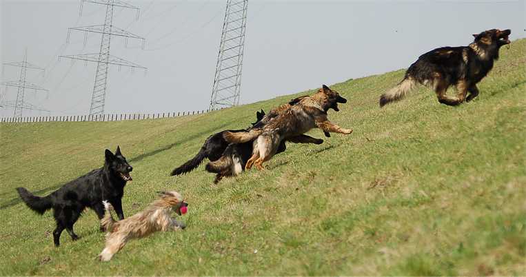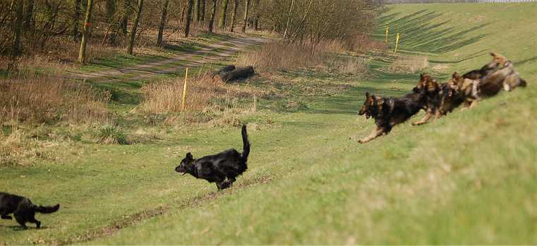 Die Hunde fanden es einfach nur Toll von links nach rechts.. Jess, nur noch das hintere Teil, Merlin (Rettungshund und Sohn von Jess) und dann Wotan mit dem Rest der Meute.