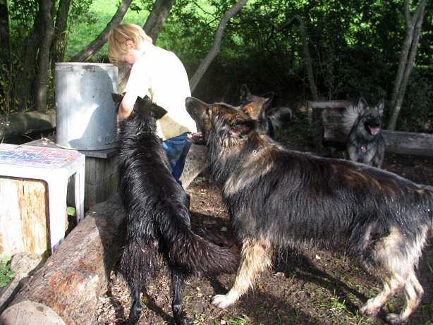 Da Lobo das erste mal Babys bekam, und ich Imelda sowieso schon immer einmal besuchen wollte, setzte ich mich am10.11. nachts um 4 Uhr kurzerhand ins Auto, packte noch Laetina, Wotan und Jess ein und machte mich auf den Weg in die Schweiz. Leider hatte ich ein paar Stau's zu bewältigen und kam erst um 15 Uhr am folgenden Mittag an. Allerdings verfuhr ich mich auf dem letzten Stück und wurde dann von Imelda in einem kleinen Dörfchen eingefangen :-) Nach einer herzlichen Begrüßung, ging es erst einmal an den hauseigenen Bach mit den Hunden zum austoben.