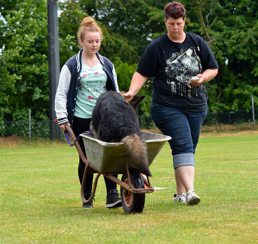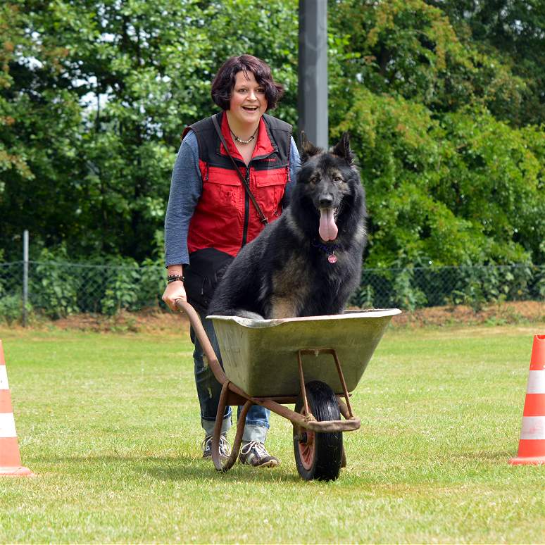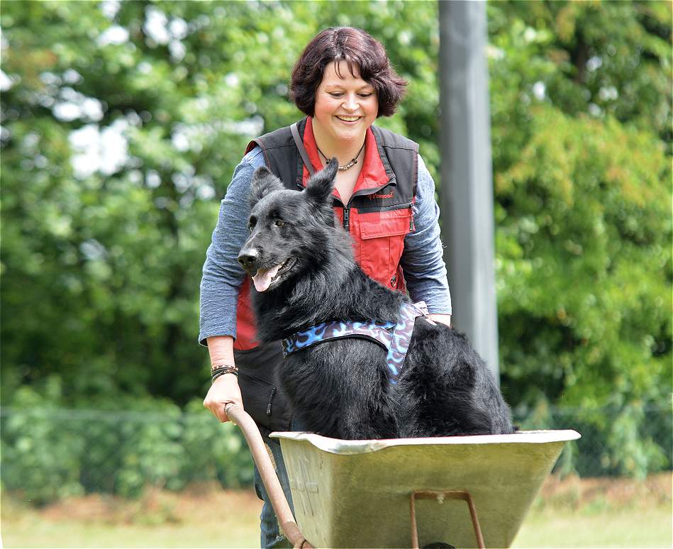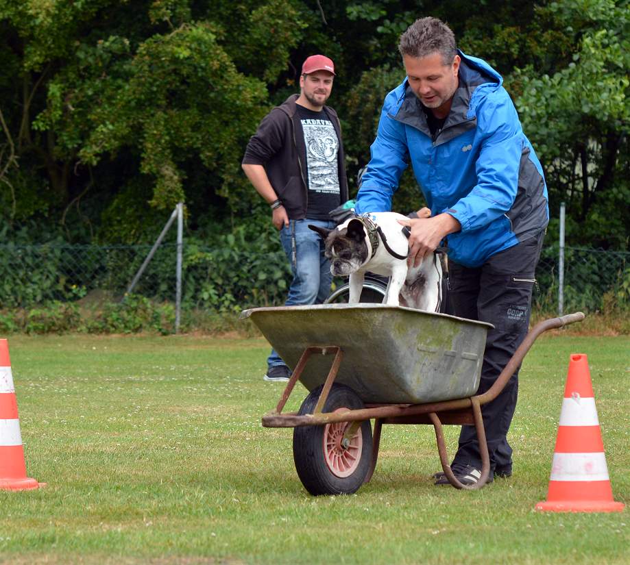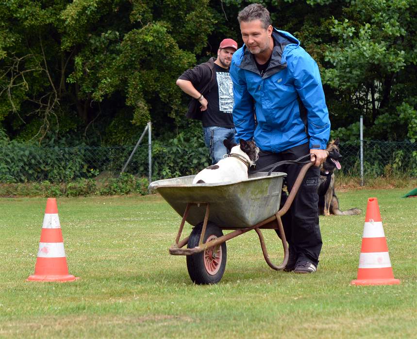 Gar nicht so leicht wie es aussieht... Schubkarre schieben und Hund soll drinnen bleiben...