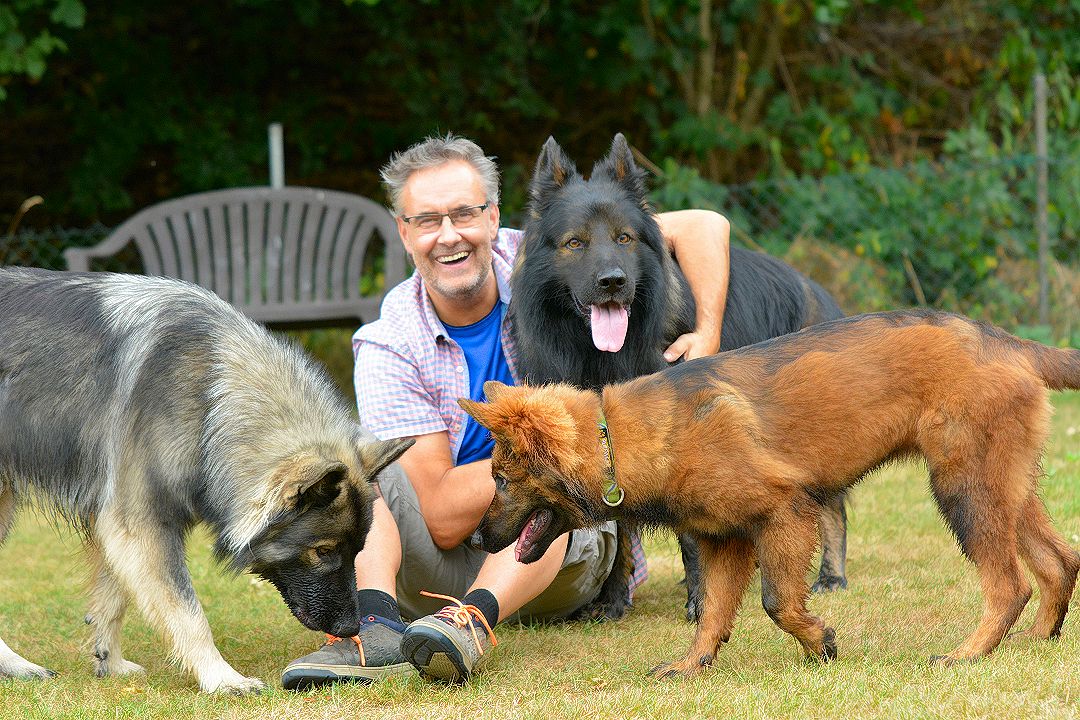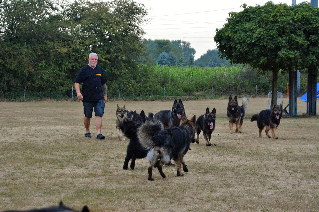 Uwe frühmorgens schon auf dem Platz mit seinen und einem Teil von unseren Hunden.