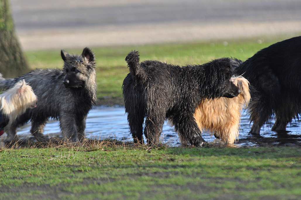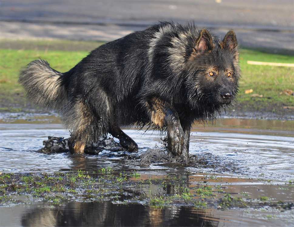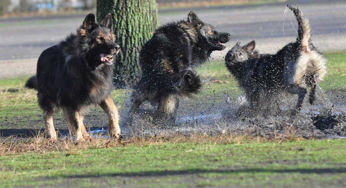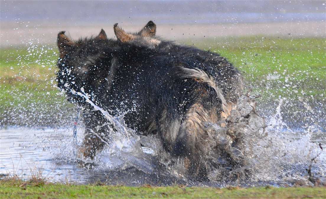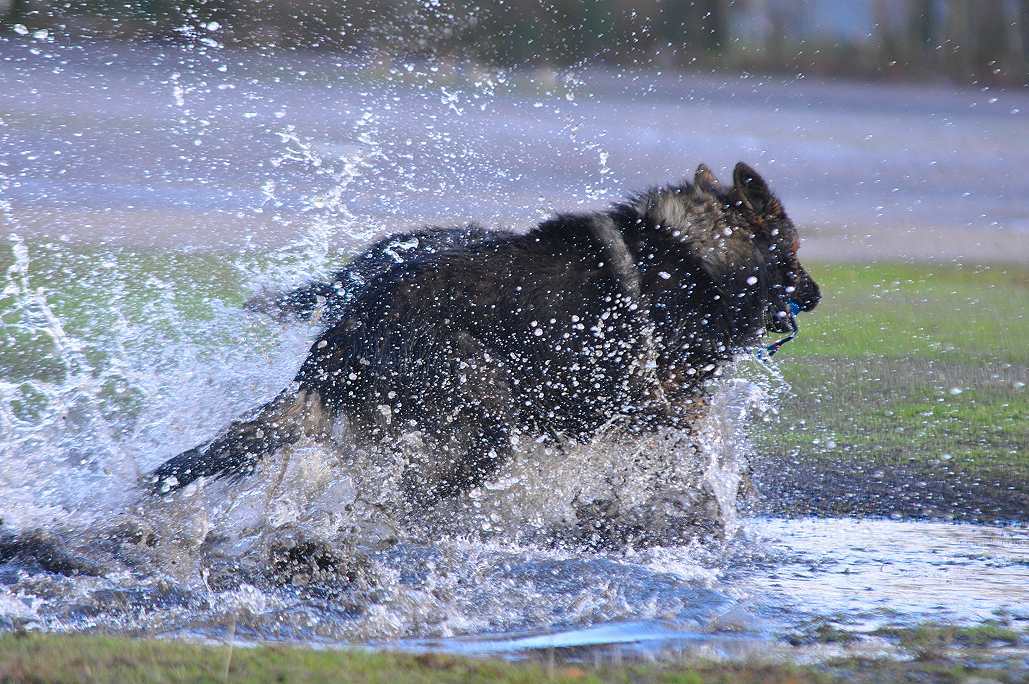Wotan stellt sich pflichtschuldigst auch einmal in eine Pfütze .. aber aufgrund seines Alters beteiligt er sich nicht mehr an den wilden Spielen der jungen Generation