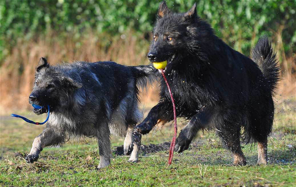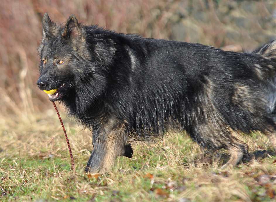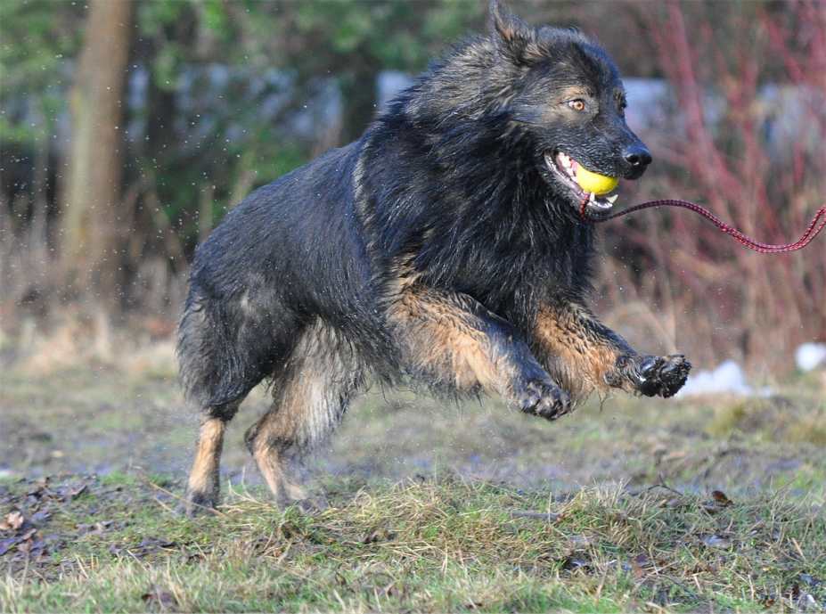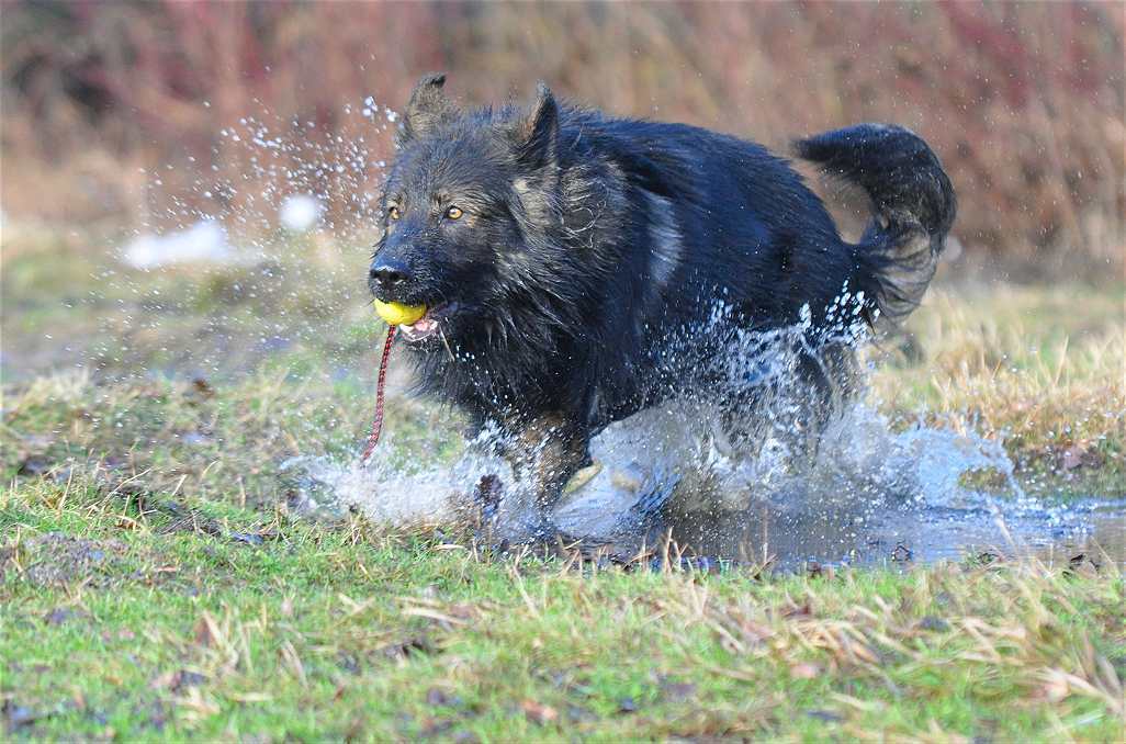 Kana .. nach ihren Welpen komplett runtergehaart, aber gnadenlos fit und inzwischen wieder genauso schnell wie Grizzly Übrigens hatte sie den ganzen Kopf gerade unter Wasser gesteckt um "Ihren Ball" auf einer sehr tiefen Pfütze zu retten :-)