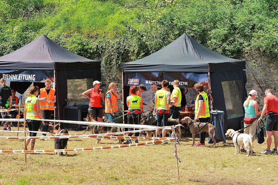 Für die Hunde war gut gesorgt, Wasser war überall zu finden, auch ein Schlauch mit denen man die Hunde komplett abspritzen konnte. Die beiden Kommentatoren, die die Teams in den Lauf entließen, die gaben wirklich alles. Begleitend mit Musik verließen die Teams den Schloßhof um als erstes den steilen Anstieg in die Weinberge zu meistern ... und angekündigt wurden die Rückkehrer ebenfalls mit lautem Beifall, viel Themenmusik und als erstes gab es dann eine Flasche alkoholfreies Bier nach der Anstrengung Zumindest habe ich Fotos von Nina und ihrem Finderwille Team bei der Rückkehr ins Schloß und bei ihrem letzten Stolperstein vor dem Ziel machen können. Zu schade das ich nur dieses eine Hindernis fotografieren konnte. Aber das hat schon für echt lustige Bilder gesorgt!