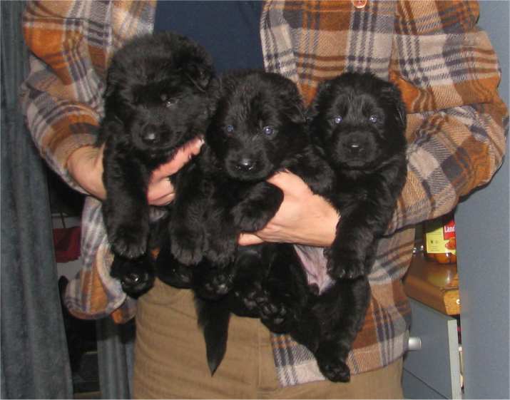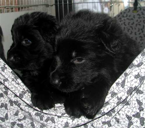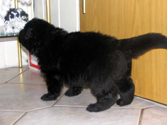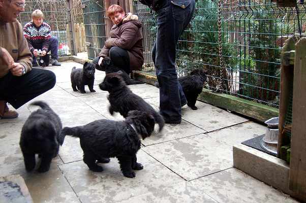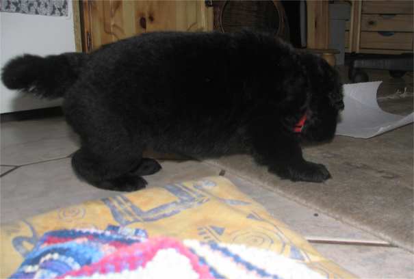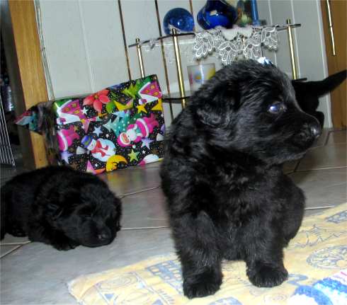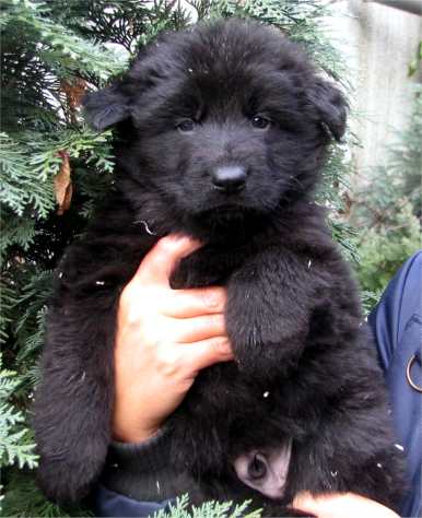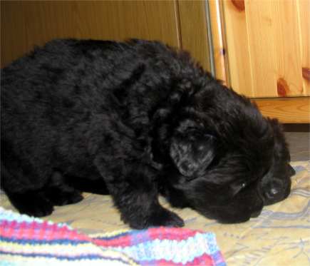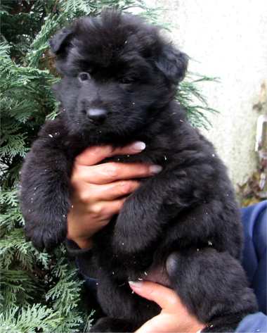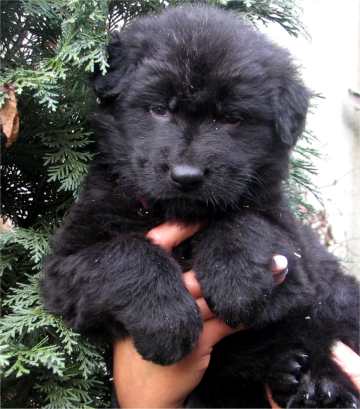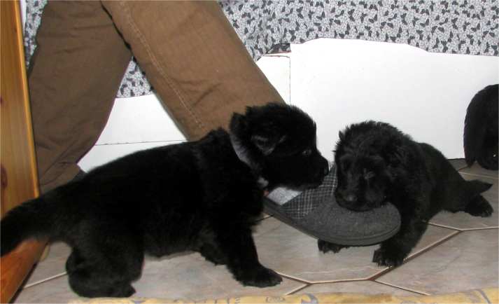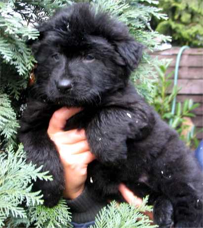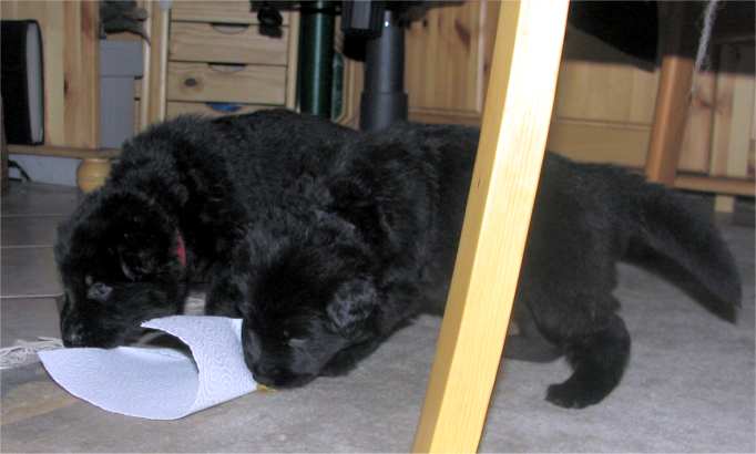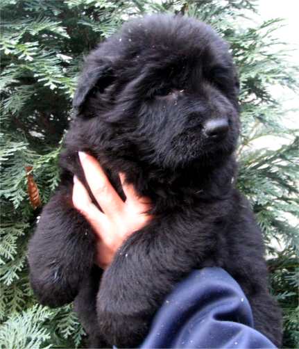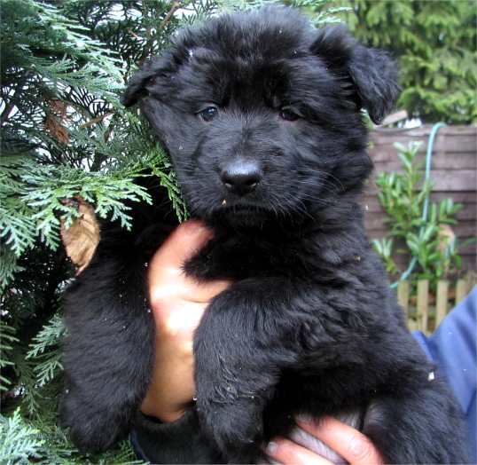 3.1.06 ..So, nun haben die Welpen die ersten 4 Wochen schon rumgebracht, sie spielen und toben nun bereits in ihrem Welpenhäuschen und auch die ersten kleinen Machtkämpfe werden nun ausgefochten. Ist irre witzig ihnen zuzusehen, man braucht gar keinen Fernseher mehr. Damit man nicht bei den ganzen schwarzen Rackern den Überblick verliert, zeigen wir sie hier noch mal einzeln, aber....es hat eigentlich keinem der kleinen gepasst ruhig auf dem Arm sitzen zu müssen :-) ..Danach haben sie sich empört geschüttelt und erst mal wieder mit Brüderchen im Stroh getobt...