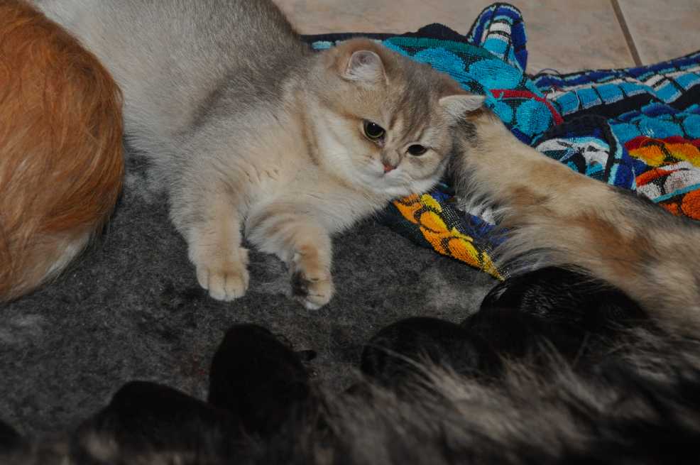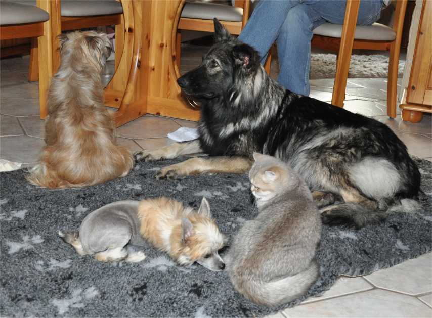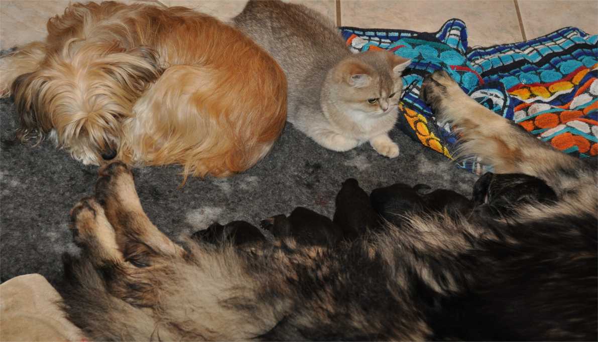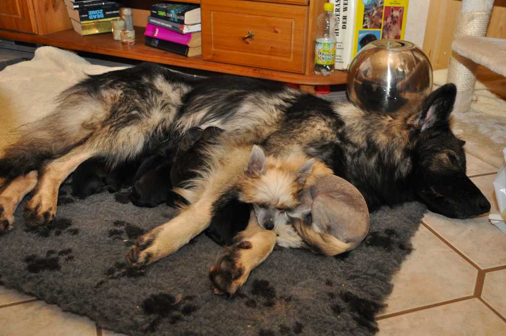 Gut, und nun etwas ernsthafter, wie man aus den vorhergegangenen Ereignissen unschwer erkennen kann, stellt Chakana sich noch ein "winziges bisschen" an. Sie muss das Mutter sein, jetzt ein bisschen lernen. leider ist es nun auch so, das sie mit ihren Babys noch nicht wirklich umgehen kann, dazu braucht es wohl noch ein paar Tage. Ihr macht es auch nichts wenn ein oder zwei Babys unter ihr liegen, sie steht dann leider noch nicht von alleine auf. So ist die Gefahr eben gegeben das in den nächsten Tagen bis sie verstanden hat, worum es geht, man wirklich sehr aufpassen muss. Ich hoffe es gelingt mir, immer rechtzeitig zur Stelle zu sein? Ansonsten haben wir 6 Jungen und 2 Mädchen Die beiden Mädchen sind Grau, wir haben 2 schwarze Jungen und 4 graue Jungen. Einzelbilder folgen natürlich in Kürze, erst einmal.... lassen wir Kana ...Mutter .. werden :-)