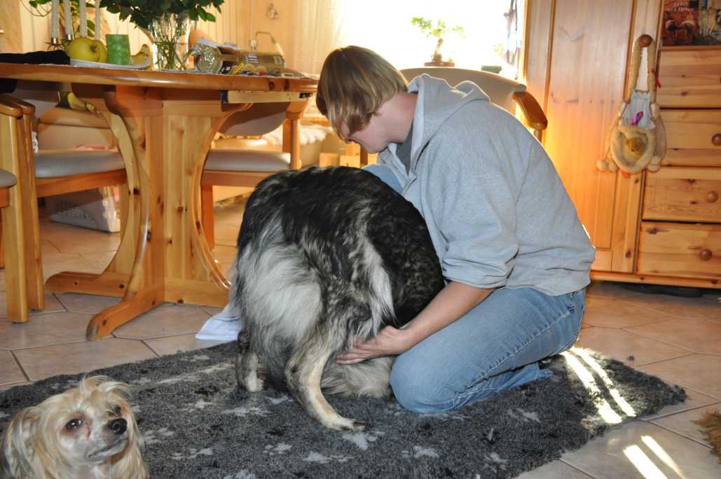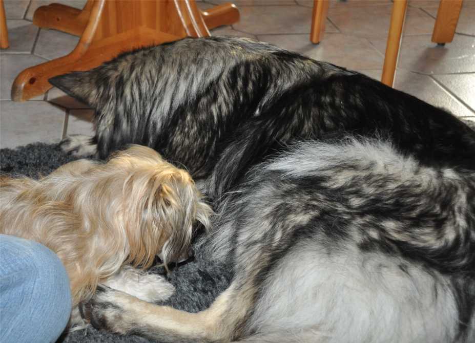 Meine kleine Chakana wird nun zum ersten mal Mama. Auf diese Traumverbindung habe ich lange warten müssen. Immer passte irgendwas nicht und ich konnte den weiten Weg zu Danger`s Fandango nicht fahren. Also wartete ich weiter geduldig ab und Chakana musste auch warten mit Mama werden :-) Aber.. nun hat es geklappt, zwar waren die Umstände ziemlich abenteuerlich, Chakana hat gemeint sie müsste sich furchtbar beeilen und hat die übliche Zeit nicht eingehalten, typisch meine verrückte Nudel!!! Die Reise war schon geplant, aber es sollte erst Tage später losgehen. Bei einem reinen Kontrollbesuch mit Kana bei meinem TA ließ ich dann am 6ten Tag ihrer Hitze einen Progesterontest machen, einfach um den Stand der Dinge zu wissen. Das war am Donnerstag, normalerweise ist es so um den 11-12 Tag soweit, das man zum Rüden fährt, also theoretisch noch jede Menge Zeit. Am Nachmittag klingelte das Telefon bei mir und mein TA erklärte mir mal eben, das Chakana, laut seinem Test schon gestern beim Rüden gewesen sein sollte... uuups... was nun... Kana ist eben Kana, immer für eine Überraschung gut. Kurz überlegt, was machen wir nun.. aber was bleibt einem denn schon, also schnell drei Teile in den Koffer geschmissen Hundefutter, Impfpässe und Zahnbürste dazu, alle Termin umgelegt, Herbert musste sich mal eben ein paar Tage Urlaub nehmen um hier zu bleiben und den Rest der Bande zu versorgen, schnell noch zwei Stunden schlafen.. Und los gings.... Unter Sehenswert "Besuch bei Tina" findet ihr weitere Details und schöne Bilder von der Schweiz.