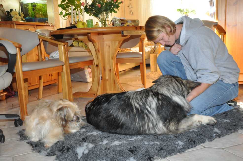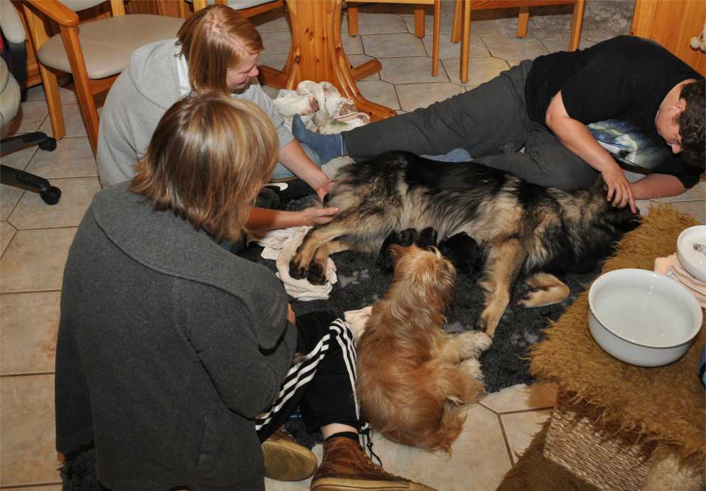 Zuschauer gab es genug, Laetina beleidigt, wollte sie doch unbedingt die Baby`s haben Kana die eh in "Ohnmacht" gefallen war und wirklich außer den Wehen nichts machte, noch nicht einmal gehechelt hat sie, auch die Atmung blieb gleichmäßig ruhig. Wenn ich sie bewegen wollte musste sie ohne Scherz erst einmal gezwungen werden, die Augen aufzumachen. Die Babys hätte sie übrigens liebend gerne an Laetina und an jeden der eins haben wollte hergeschenkt! :-) Wir hatten wirklich einen tollen Abend, es war lustig und entspannt ohne Ende, Die Geburt war eigentlich ein Spaziergang, wenn man von Chakana`s ""Bewustlosigkeit"", die aber immer blitzschnell unterbrochen wurde, wenn man ihr einen Topf mit Leckereien hinhielt Quark mit Eigelb und Tartar war der Favorit :-) nur um.. wenn das alle war.. wieder in "Ohnmacht" zu fallen, mal absieht :-)