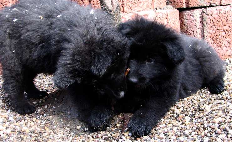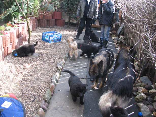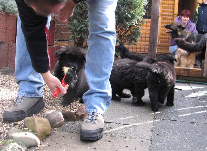Also Leute heute der 4.3.07 war ein echt merkwürdiger Tag, schon ganz früh morgens kamen viele Menschen zu Besuch, die meisten kannten wir ja schon, aber soooo früh sind die sonst nicht gekommen, aber egal, sie haben uns Leckerchen mitgebracht und mit uns gespielt und viele schöne Sachen gemacht, also der Freitag der war ja noch komischer, da kam erst so ein Mann mit einer Tasche, der hat uns überall hingeguckt..in den Ohren sogar und mit sonem kalten Ding was er uns an die Brust gehalten hat, hat er uns abgehört und ganz doll abgetastet hat er uns auch und dann, das war ja gemein hat er uns alle nacheinander gepickst, ganz schön dolle... Frauchen hat gesagt wir sollen tapfer sein, der Mann wäre ein DOKTOR und der guckt nur ob wir auch alle ganz gesund sind und der impft und chippt uns dann?? also ganz so prickelnd war das ja nun nicht.. Und dann kamen fremde Leute...3 Stück und die haben uns dann auch noch auf den Arm genommen und in den Mund geguckt die Zähne angeguckt, und umdrehen mussten wir uns..wegen nem Nabelbruch oder so?? keine Ahnung.. so was haben wir nicht, und an den Schwänzen haben sie uns auch gezogen, wegen "Knickschwanz"?? mönsch was war das echt blöd, also wenn wir Knicke in den Schwänzen hätten?? Aber heute die Leute waren echt supernett, das Wetter war toll, und wir haben ganz viel Spaß gehabt. Frauchen hat gesagt, heute ziehen wir aus, aber erst einmal haben wir noch den ganzen Tag mit unseren neuen Menschen spielen dürfen.... |