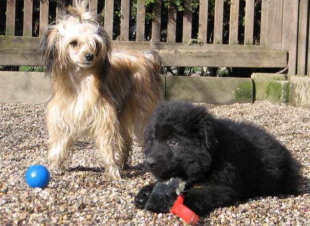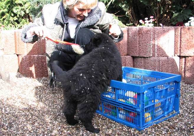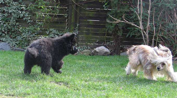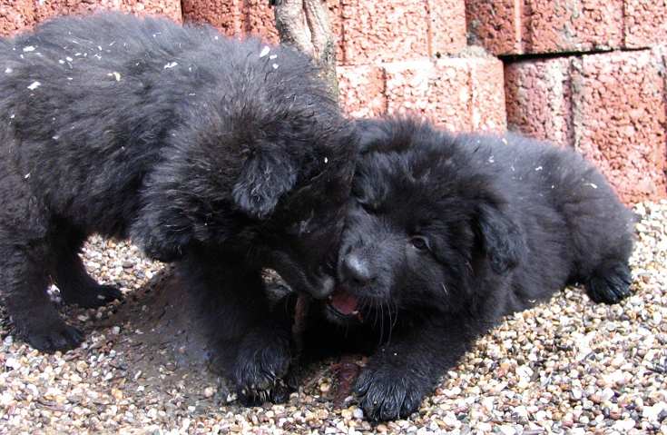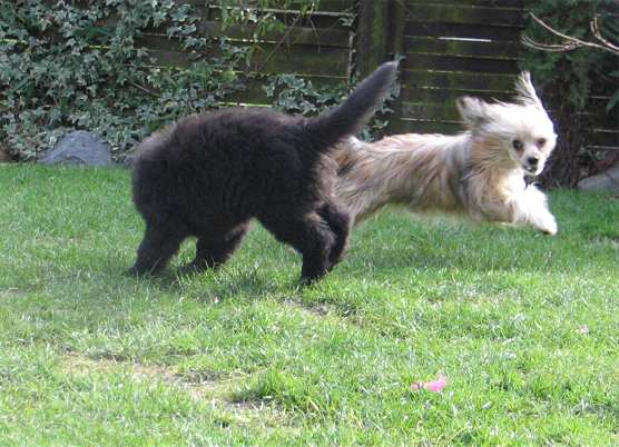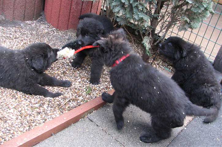 Matsche.... spielen ist wohl für alle "kleinen" interessant?? Den Welpen macht das Usselwetter gar nichts?? Ihr müsstet mal sehen wie sehr sie umhertoben, das kann man auf den Bildern überhaupt nicht nachempfinden und die kleinen zu fotografieren, wenn sie sich gegenseitig jagen und "Burg" spielen (Burg nennen wir so, das Spiel geht dann folgendermaßen vor sich... einer der Welpen erobert eine Hütte von den "Großen" sitzt drin, und lässt keinen anderen rein, erst wollen dann nur zwei ..UNBEDINGT.. auch rein, dann etwas später wollen natürlich alle rein, und derjenige der ..Verteidigt.. wird dann meistens im Sturm überrannt, das ganze geht natürlich nicht sehr leise vor sich...) Aber nun fotografiert das Gewusel mal..geht gar nicht, und wenn sie rennen, zum Beispiel hat Laetina nun nicht mehr viel zu melden, Laetina also vorneweg und ne Horde schwarzer Welpen hinterher, sieht toll aus...aber kann ich leider nicht fotografieren, immer alles unscharf :-(
