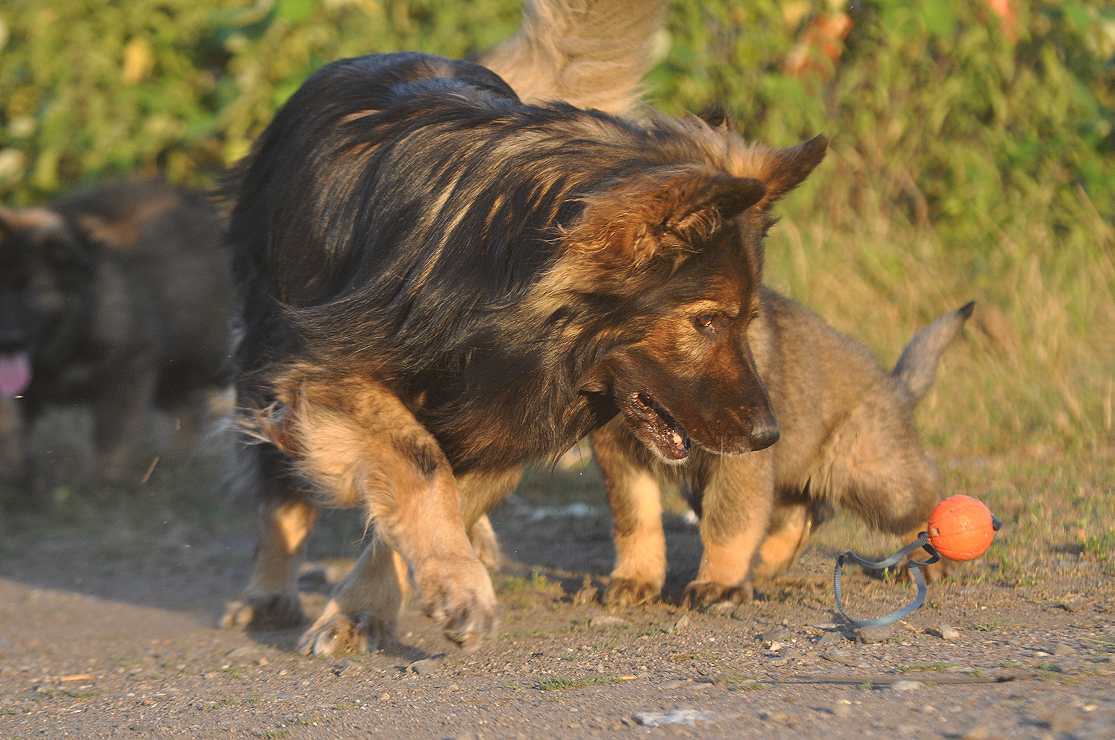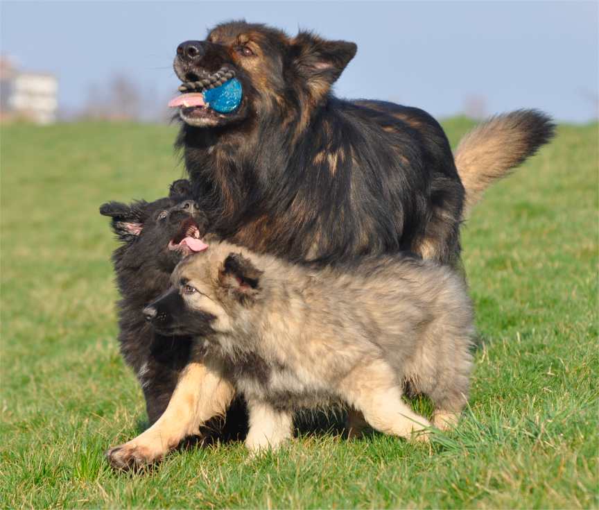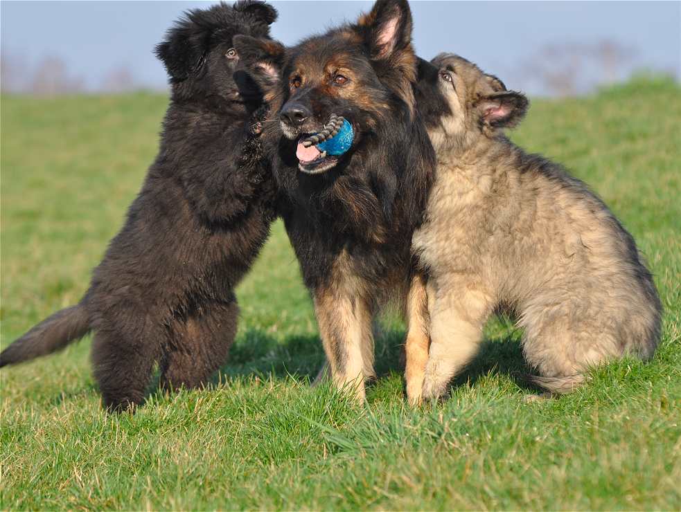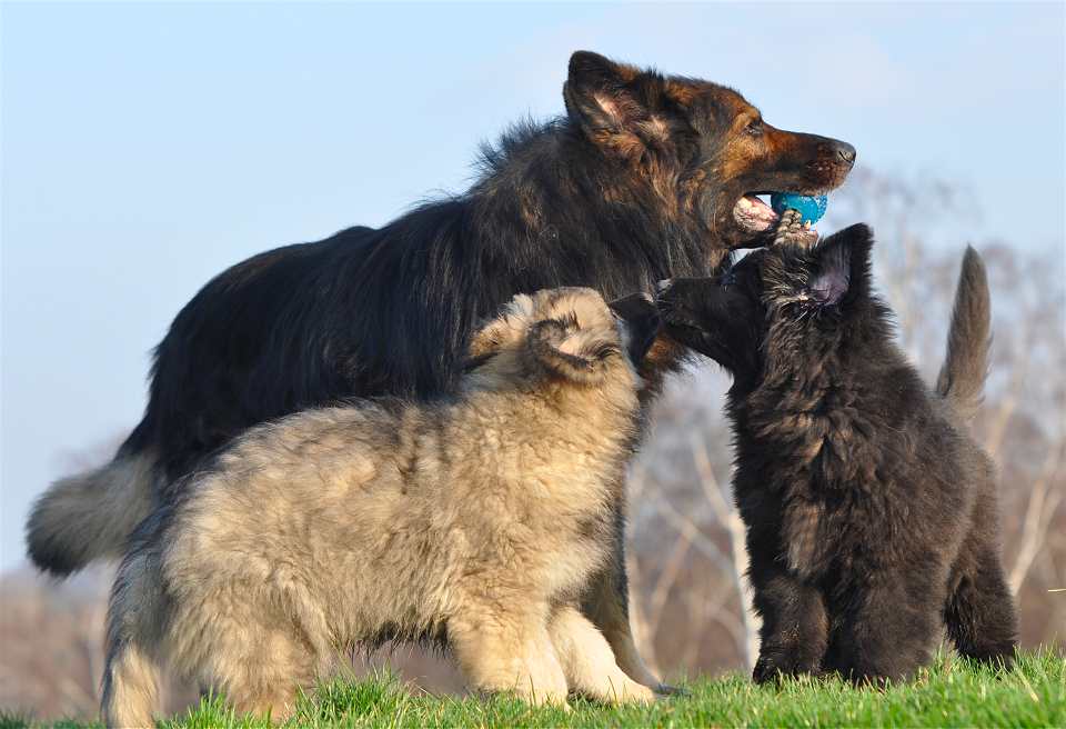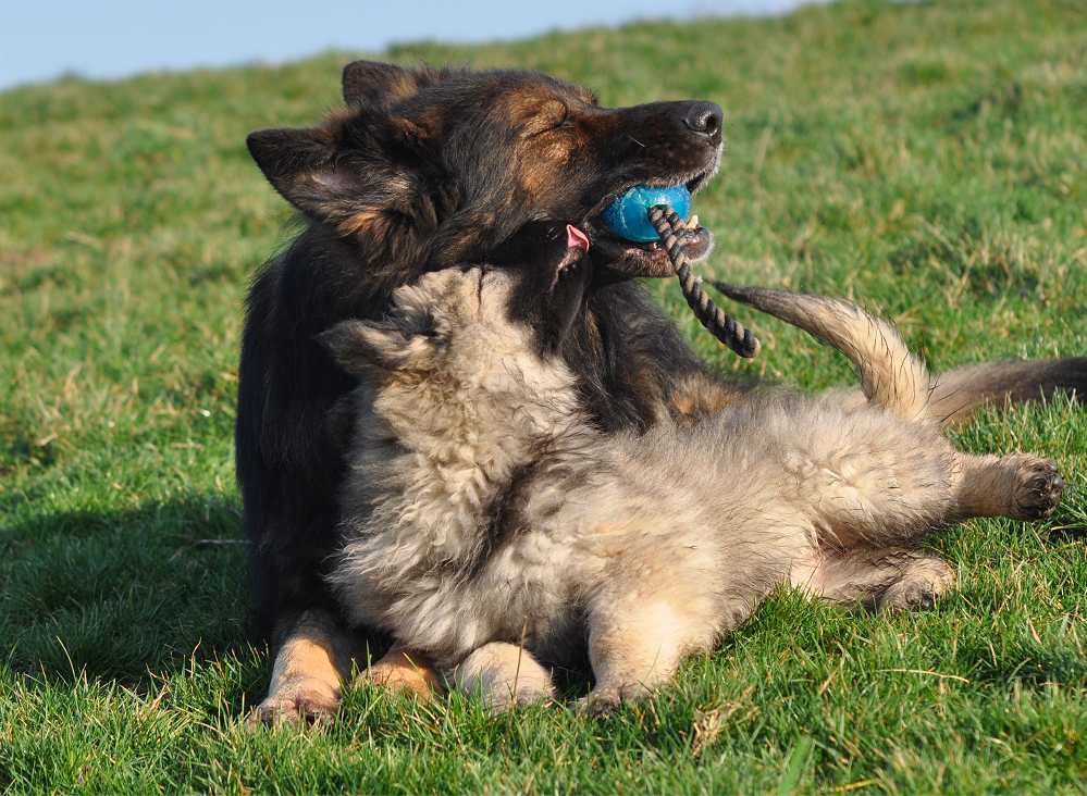 Er gibt ihnen das Spielzeug, er zeigt was man für schöne Sachen damit machen kann. Die Welpen haben in ihm alles was man sich als junger Hund wünschen kann. Sicherheit, Führung, Geborgenheit und absolutes Vertrauen. Auch das lehrt er sie.