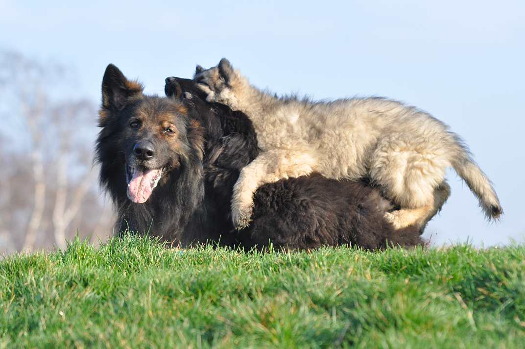 Sie folgen ihm, von der ersten Minute an, in dem sie ihn kennen lernen dürfen. Die "Mütter" gehen an die Seite und Wotan führt sie, meist im Alter von 3-4 Wochen in den Garten. Und von da an...gehören sie Wotan! Ich habe in meinem ganzen Leben niemals einen solch sicheren, duldsamen und aufopferungsvollen Rüden kennen gelernt. Er verteidigt sein Rudel gegen ""Gefahren"" rigoros und ohne Kompromisse. Er schützt, und behütet und... ist mit allen Babys ... jung und voller Blödsinn. Mein Wotan, die beste "Mutter" die man sich nur wünschen kann!