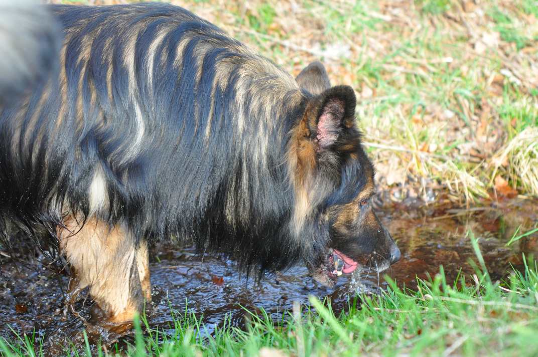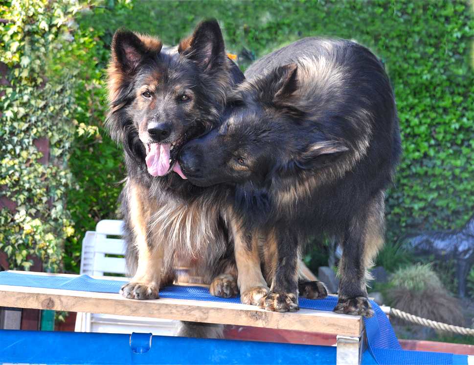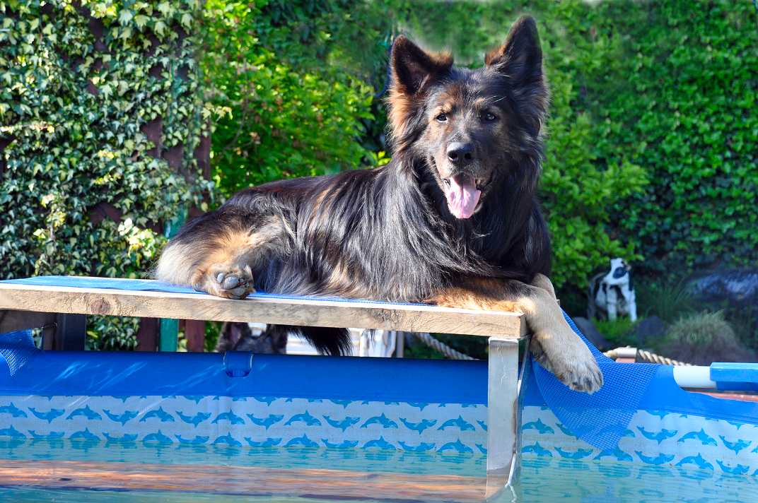 Mein oller Krawallschläger, starrsinnig und laut ist er geworden unser Opa.. Wenn er meint er steht nicht im Mittelpunkt des Geschehens, dann wird erstmal lauthals Beschwerde eingelegt. Der Pool ist seit ein paar Tagen fertig und alle finden es toll, auch mein oller Wotan muss ja unbedingt die Treppe hochkraxeln und mindestens auch einmal rein. (natürlich steht immer jemand in der Nähe) Grizzly inzwischen längst erwachsen, zollt Wotan immer noch die nötige Anerkennung und versichert ihm, das er der Chef ist. Wotan.. immer noch dabei und immer noch an vorderster Front!