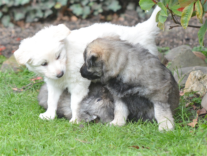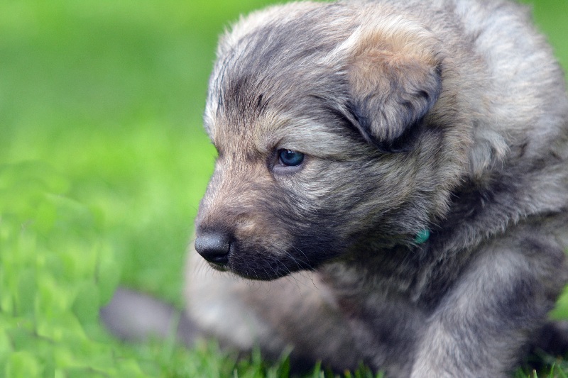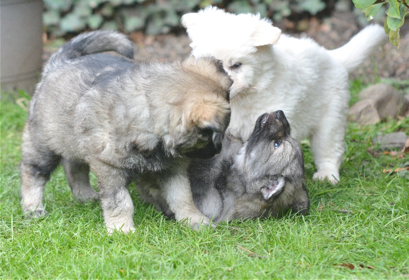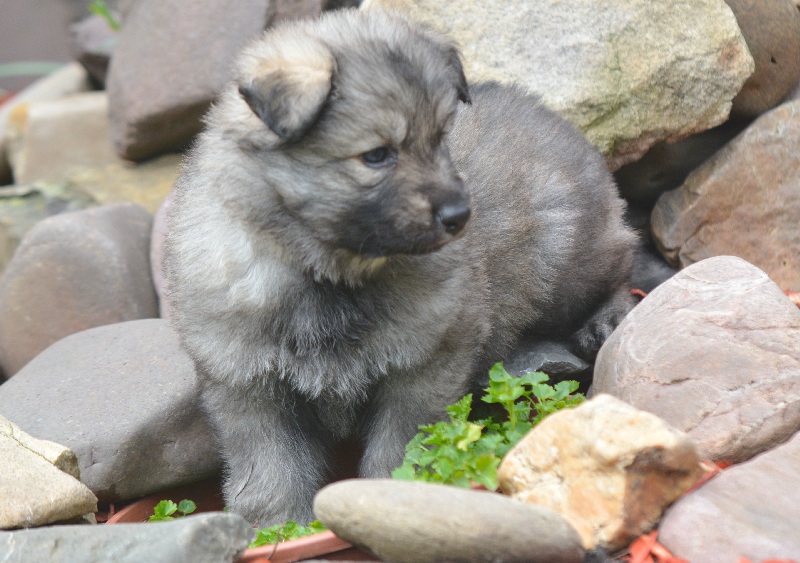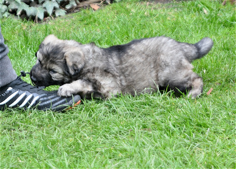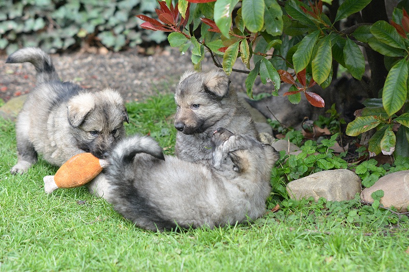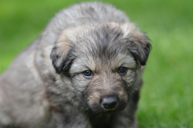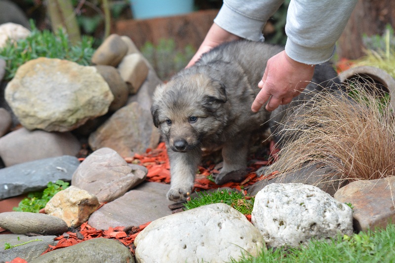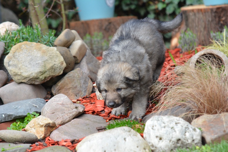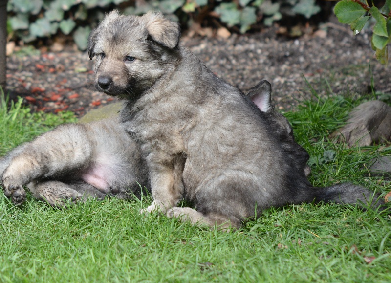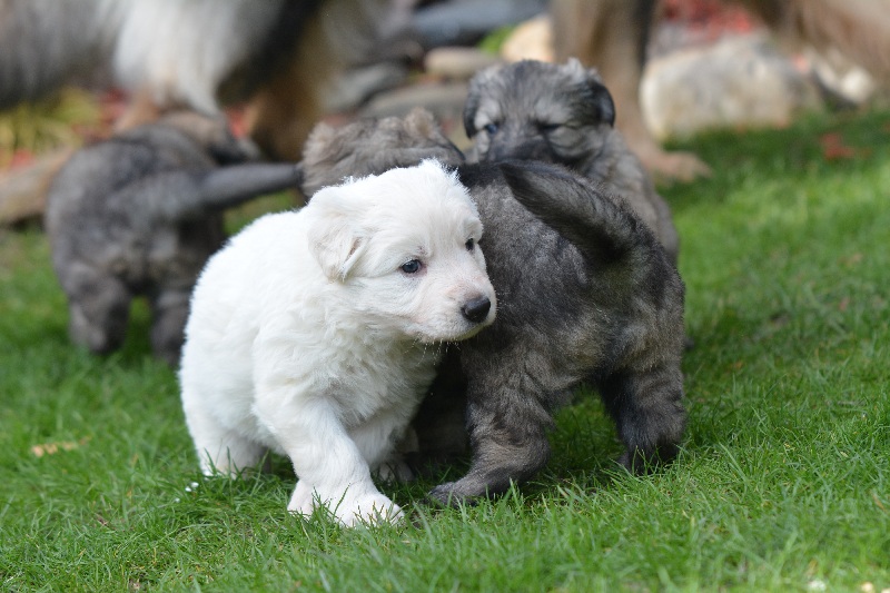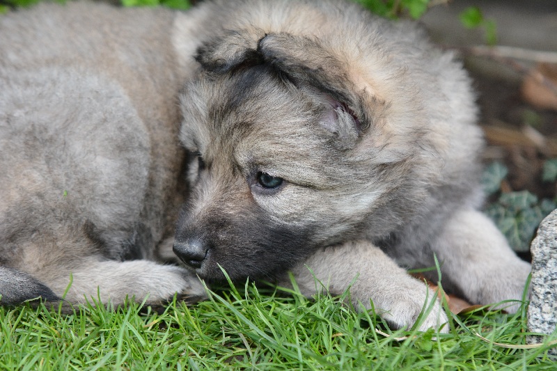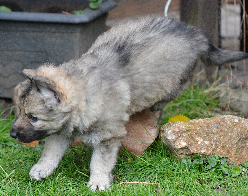 ![]() Spannend hier draußen Die Kleinen entwickeln nun auch schon ihre wolfsgraue Färbung. Das hier ist Yro, er geht zu Angelo, dem Deckrüdenbesitzer. Er hat natürlich einen ganz fehlenden schwarzen Fang, und ist aber auch der kürzeste im Fell. Ich bin selber gespannt wie er sich entwickelt. Da ja alle Babys selbstverständlich langhaarig sind ist es jetzt schon spannend zu sehen das Yro sich von den anderen ein wenig abhebt. |