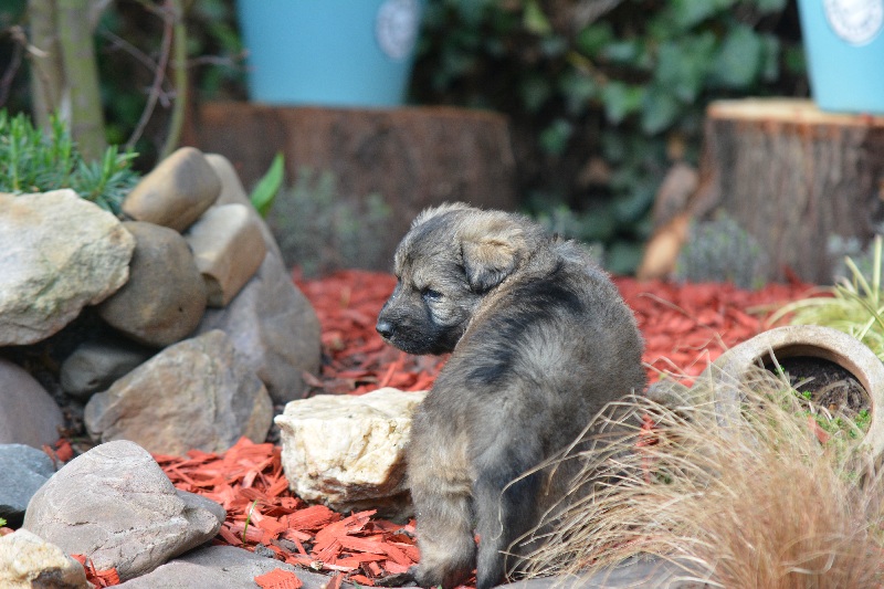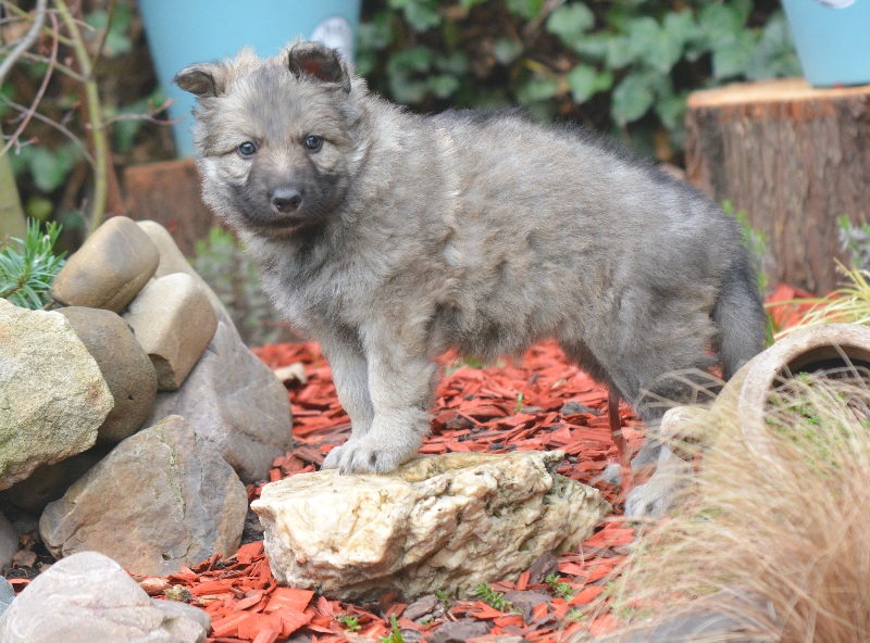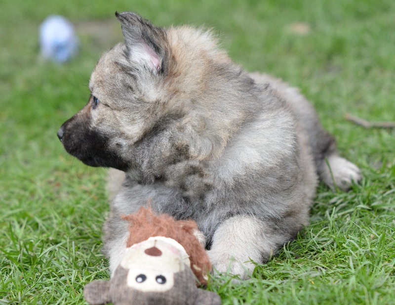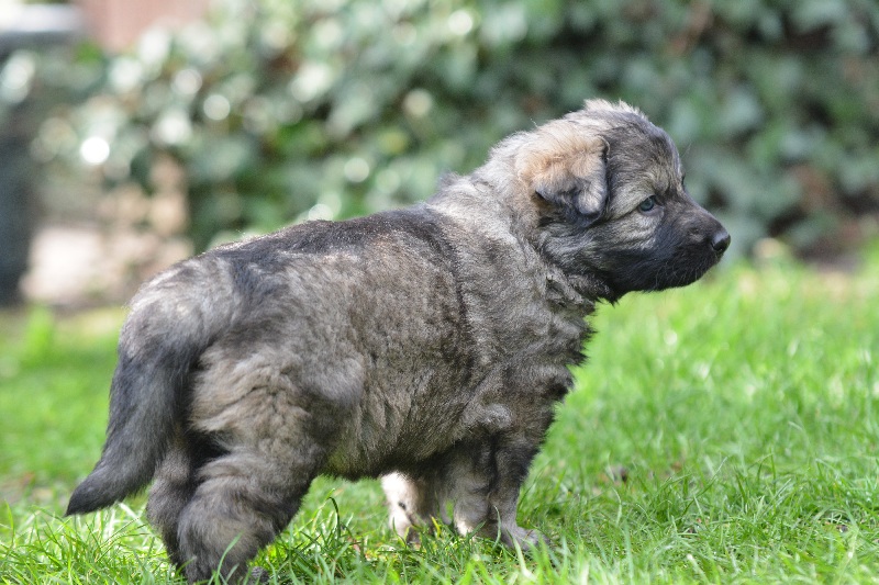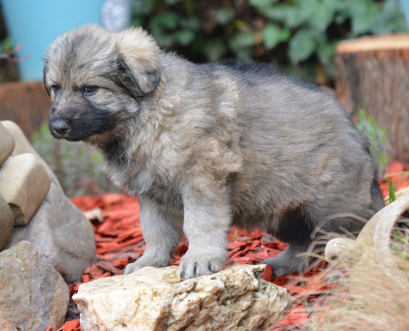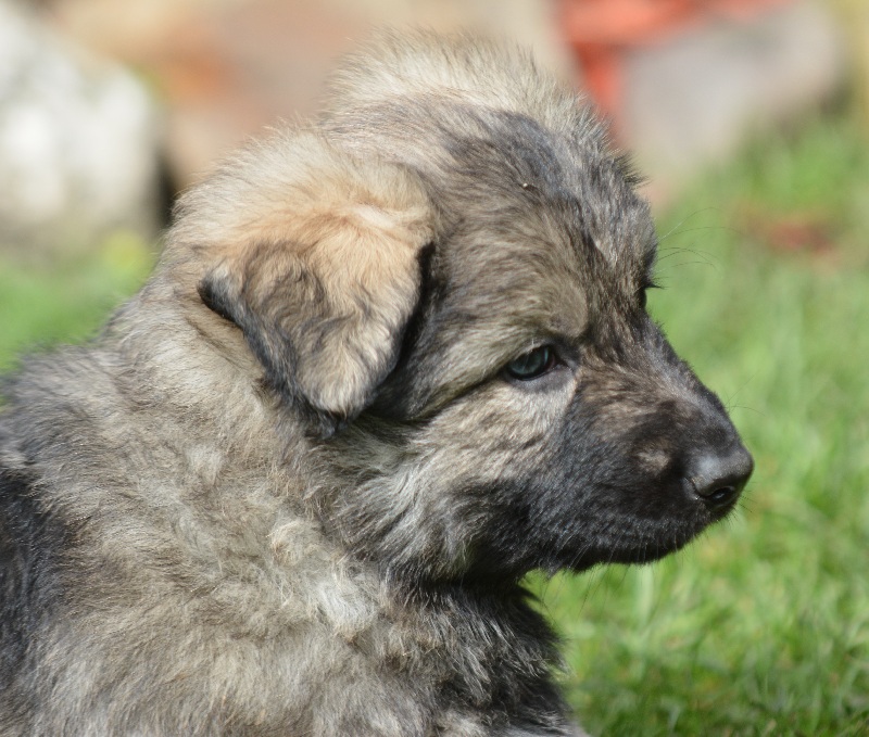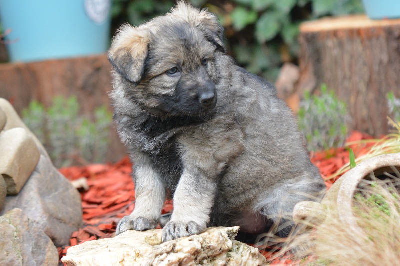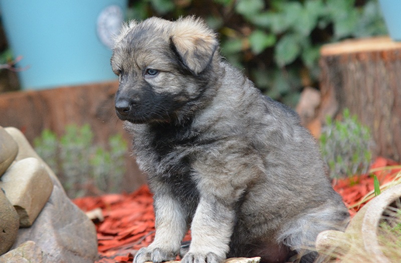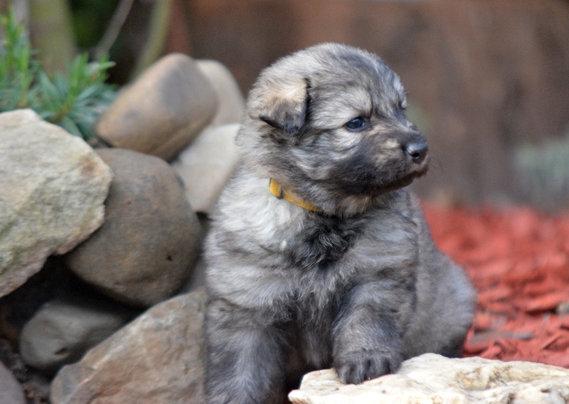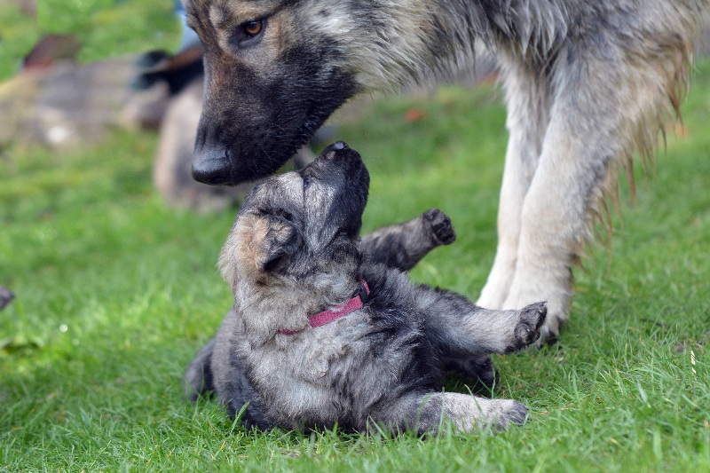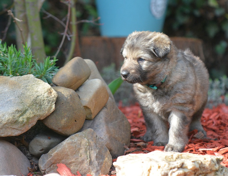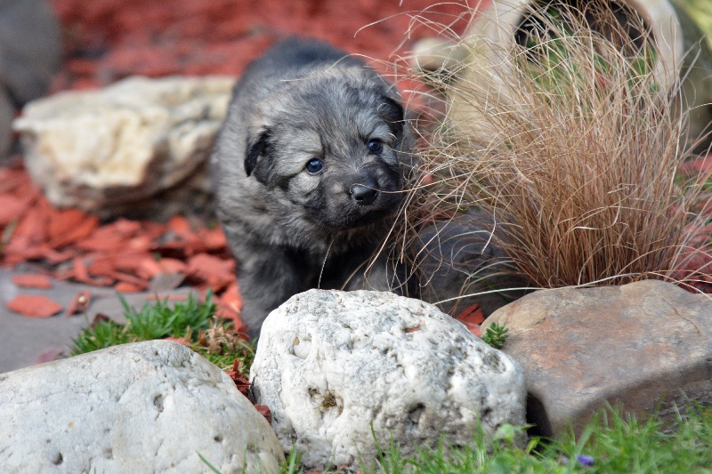 ![]() Spannend hier draußen Die Kleinen entwickeln nun auch schon ihre wolfsgraue Färbung. Das hier ist Yro, er geht zu Angelo, dem Deckrüdenbesitzer. Er hat natürlich einen ganz fehlenden schwarzen Fang, und ist aber auch der kürzeste im Fell. Ich bin selber gespannt wie er sich entwickelt. Da ja alle Babys selbstverständlich langhaarig sind ist es jetzt schon spannend zu sehen das Yro sich von den anderen ein wenig abhebt. |